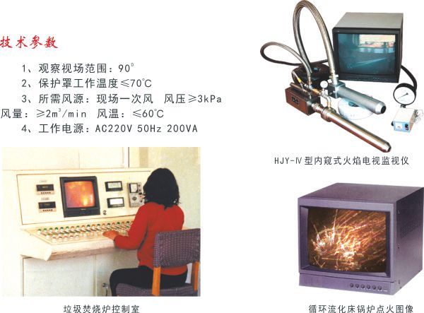 HJY-Ⅳ型內(nèi)窺式火焰電視監(jiān)視儀是用于監(jiān)測爐內(nèi)照度較低的循環(huán)流化床鍋爐及垃圾焚燒爐爐內(nèi)物料狀態(tài)的彩色工業(yè)電視系統(tǒng),該產(chǎn)品是我公司技術(shù)人員與光學(xué)研究所部分科技人員專門針對循環(huán)流化床鍋爐和垃圾焚燒爐而共同開發(fā)研制的,只要光照度大于10LUX的環(huán)境條件即能清晰成像,在國內(nèi)處于領(lǐng)先地位。對于循環(huán)流化床鍋爐,因為爐內(nèi)為密封狀態(tài),在點火及投料過程中極易造成高溫或低溫結(jié)焦,而爐內(nèi)照度又很低,用國內(nèi)現(xiàn)有的爐膛火焰監(jiān)視裝置看不到爐內(nèi)物料狀態(tài)。如采用HJY-Ⅳ型產(chǎn)品可看到爐內(nèi)物料狀態(tài)并指導(dǎo)投料并及時發(fā)現(xiàn)結(jié)焦趨勢,從而避免結(jié)焦或投料過多造成點火過程中滅火。而垃圾焚燒爐,由于污染問題,爐體為密封式,投料后極易將火壓滅,即使在燃燒時,爐內(nèi)照度也非常低,通常在300LUX以下,而國內(nèi)常規(guī)產(chǎn)品需在500LUX照度下才能工作。所以只有采用HJY-Ⅳ型產(chǎn)品,才能指導(dǎo)投料及探針插孔并在遠離現(xiàn)場的操作室內(nèi)清晰看到爐內(nèi)的垃圾焚燒狀態(tài),從而實現(xiàn)安全經(jīng)濟運行。
